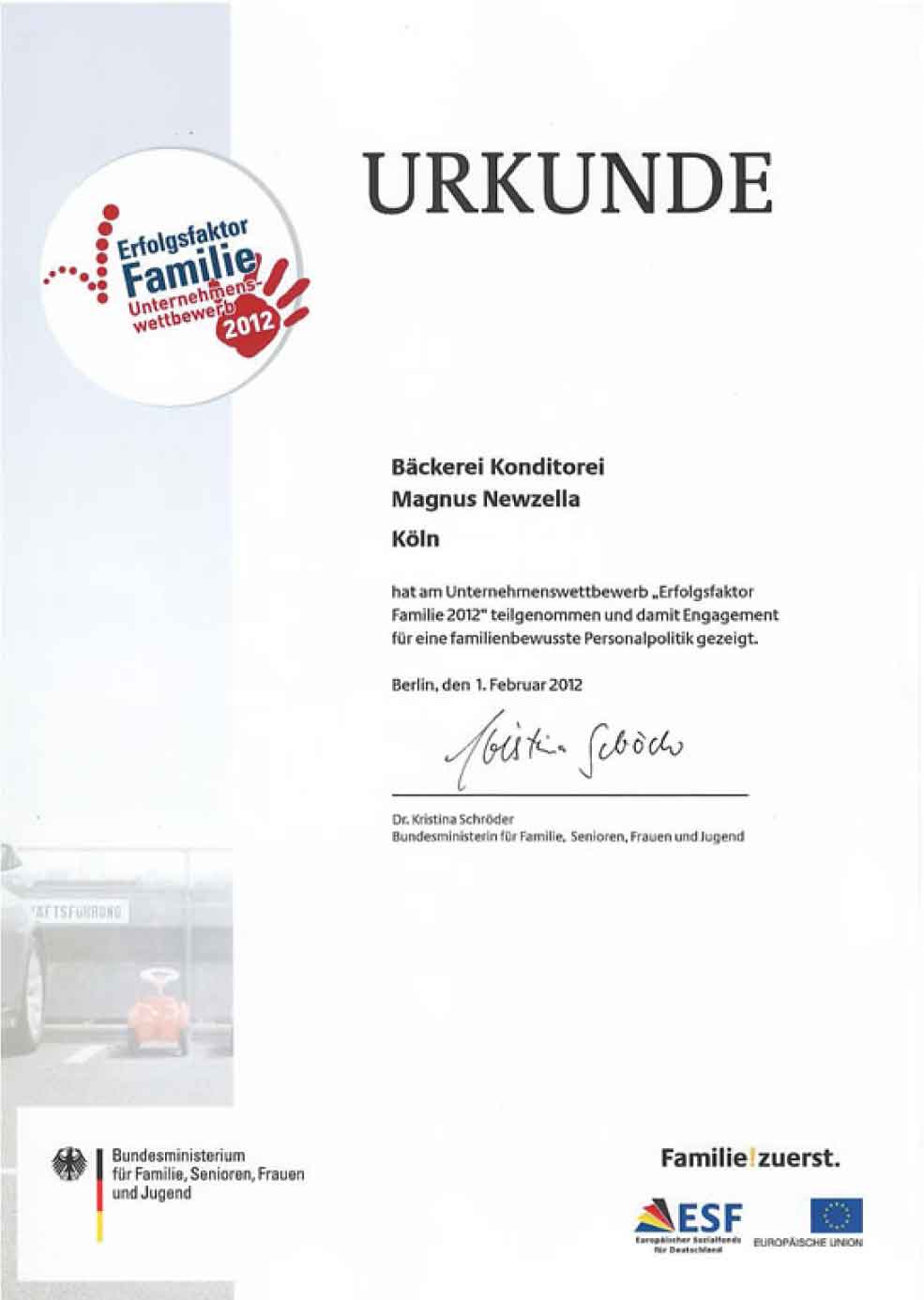 Die Vereinbarkeit von Familie und Beruf wird bei uns gelebt! Unsere Mitarbeiter und ihre Familien liegen uns am Herzen. Für unsere Teilnahme am Unternehmenswettbewerb „Erfolgsfaktor Familie 2012“ wurde uns jetzt diese Urkunde verliehen.